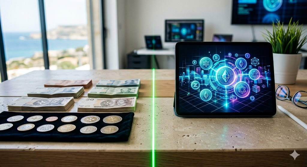 | Form | Tangible coins and notes. | Electronic data and code. |