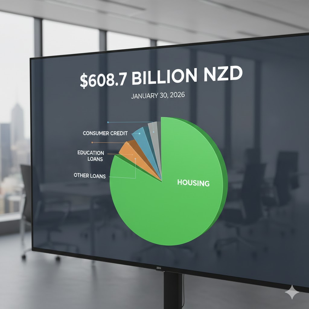 As of late 2025, non-government debt in New Zealand totaled $608.7 billion, with housing debt making up about 64% of that figure.