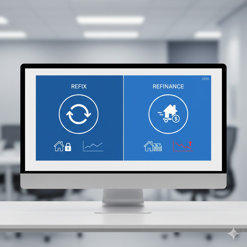 Refixing involves choosing a new rate with your current bank, whereas refinancing involves moving your entire mortgage to a completely new lender to get better terms or cash back.